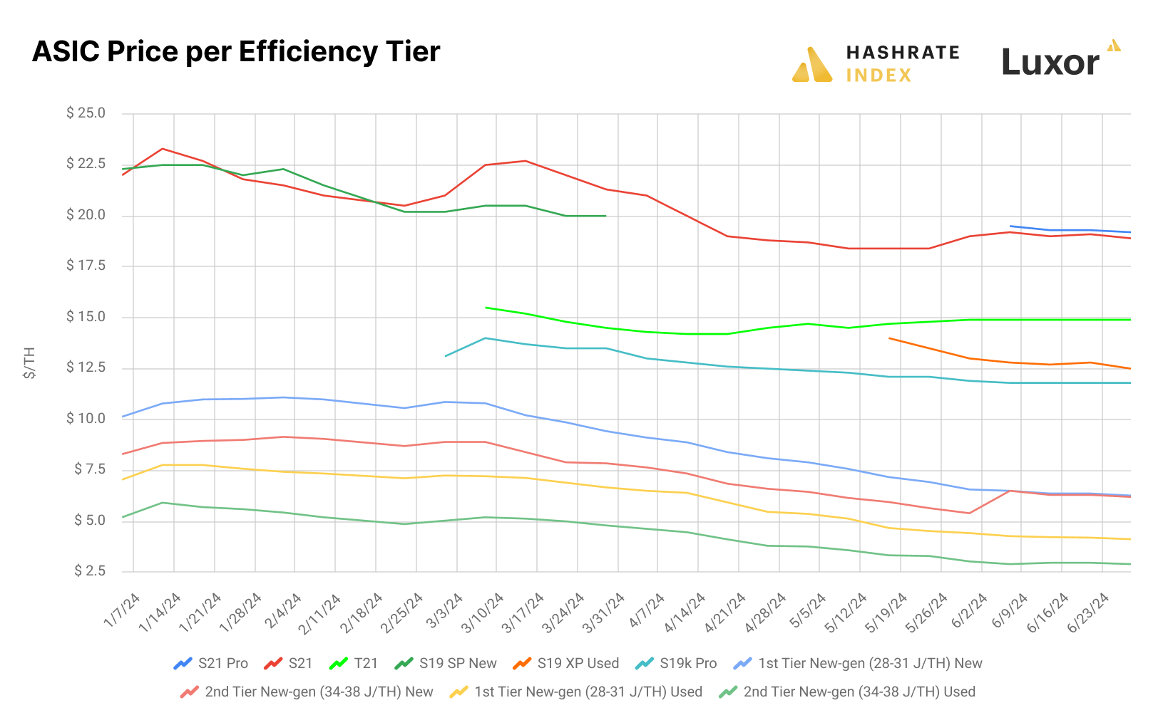 The latest generation of Bitcoin miners like the S21 and T21 fared much better than others in Q2 as Bitcoin miners sought the most efficient rigs to weather the post-halving market environment. The S21 fell in price leading up to the Halving, indicating that it was overpriced despite its industry-leading efficiency at launch, but it rebounded over the remainder of the quarter; it closed Q2 in the red, but only marginally so.