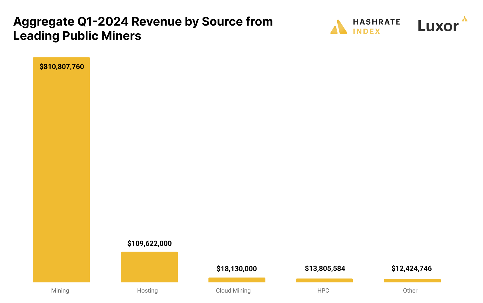 Looking at Q1-2024 revenues, we can see that self-mining (unsurprisingly) still comprises the bulk of public miner revenue. And despite all of the chest-beating about AI and HPC strategies, these business lines make up a fraction of a fraction of overall revenue (although this could obviously change in the future, as AI / HPC business lines are still in the early innings.