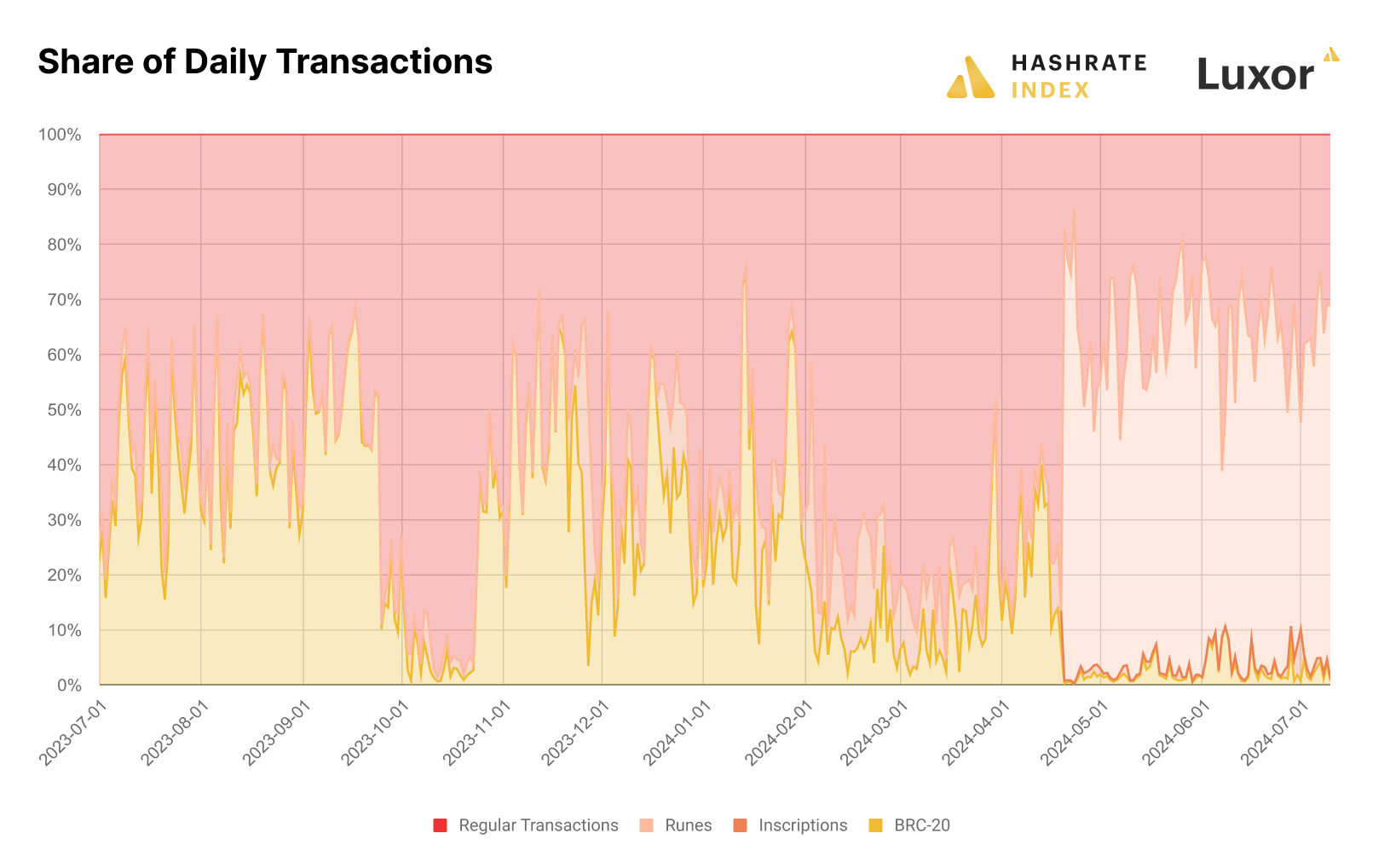 If we zoom in on transaction fee volumes, perhaps it’s not fair to say that enthusiasm for Runes has been dying since the Halving. In fact, Runes have consistently constituted the majority of Bitcoin’s transaction fee volume since launch, but they are not creating the same pressure on Bitcoin blockspace as BRC-20 tokens and thus are not generating as many fees. BRC-20 tokens are like proto Runes; they are text based and have the same minting capabilities as Runes, although they use the Segwit data field to store token information, whereas Runes use OP_RETURN for token info. In fact, Casey Rodarmor designed Runes to be a more data-efficient, elegant alternative to BRC-20, and given that Runes minting and trading have eclipsed BRC-20 tokens without sending fees to the stratosphere, he seems to have achieved his goal.