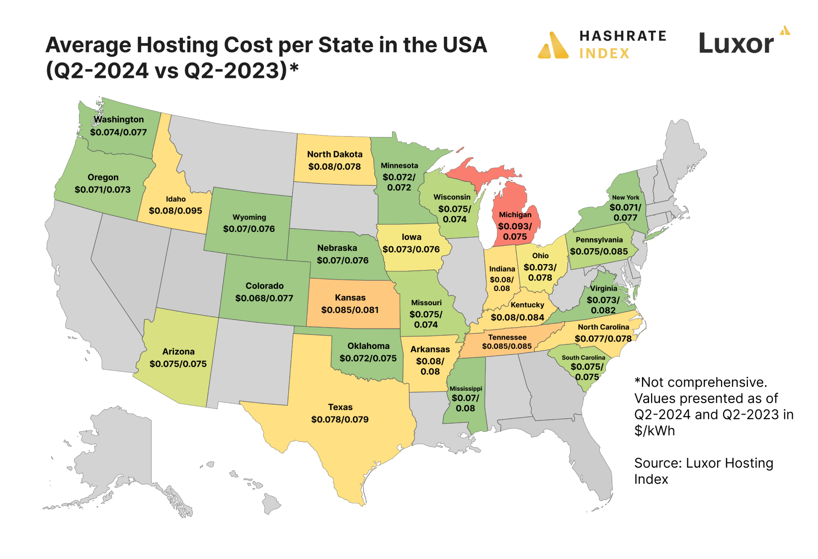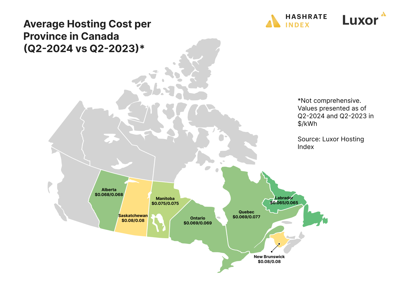 At current hashprice levels, only those miners with the latest generation ASICs are operating at comfortable profit margins. According to Luxor’s Hosting Index, in the United States, the average hosting rate in Q2-2024 was $0.076/kWh, which is down 2.7% from Q4-2023 and 3.6% from Q2-2023. In Canada, the average hosting rate in Q2-2024 was $0.072/kWh, which is up 1% from Q4-2023 and flat from Q2-2023. (We did not collect data for Q1-2024).