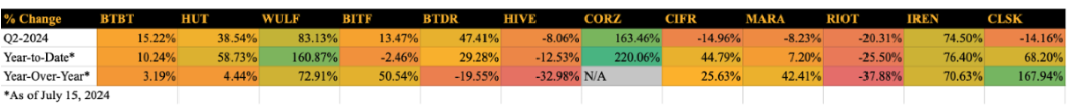 The majority of the leading Bitcoin mining stocks were in the green quarter-over-quarter by the end of Q2, and as of July 15, 2024, most of them were also in the green year-to-date.
