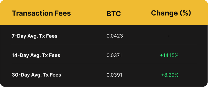 Over the past week, Bitcoin miners collected an average of 0.0423 BTC (per block, per day) in transaction fees compared to the prior week's 0.0326 BTC, a 30% increase.