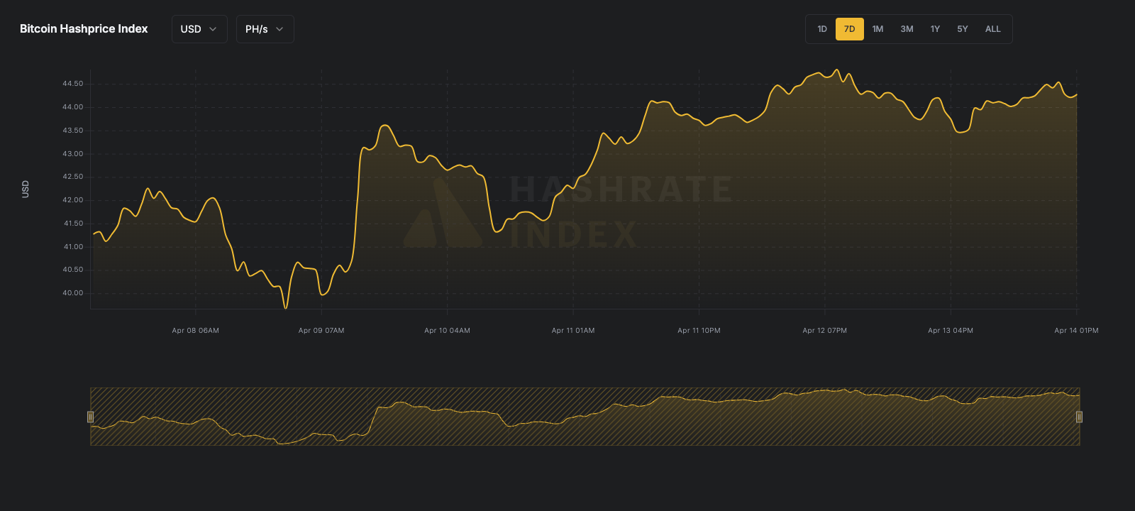 USD hashprice trended up, increasing by 7.46% from $41.28 per PH/s/Day to a current $44.36 per PH/s/Day.