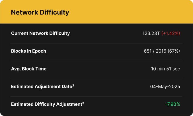 The latest difficulty adjustment took place over the weekend on April 19, increasing network difficulty by 1.42% to a new all-time high of 123.23T.