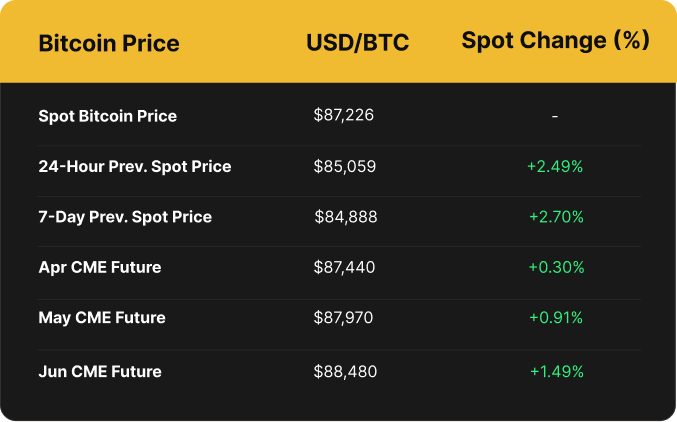 Bitcoin trended up throughout the past week, increasing by 2.19% from ~$85,358 to a current price of ~$87,231. Year-to-date performance stands at -6.67%.