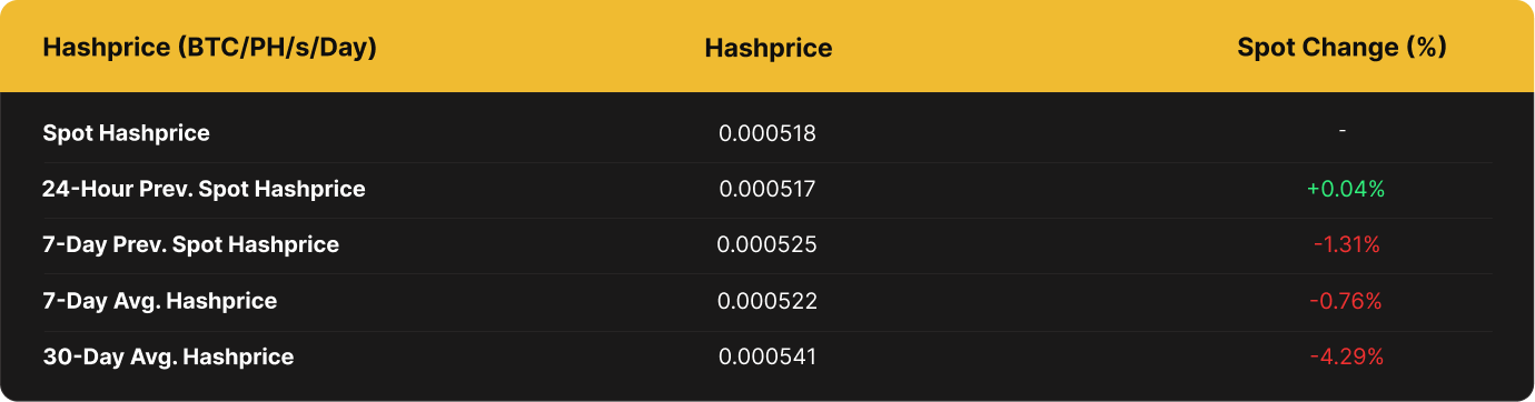 BTC hashprice decreased by 1.32% from 0.00052456 BTC per PH/s/Day to a current 0.00051765 per PH/s/Day.