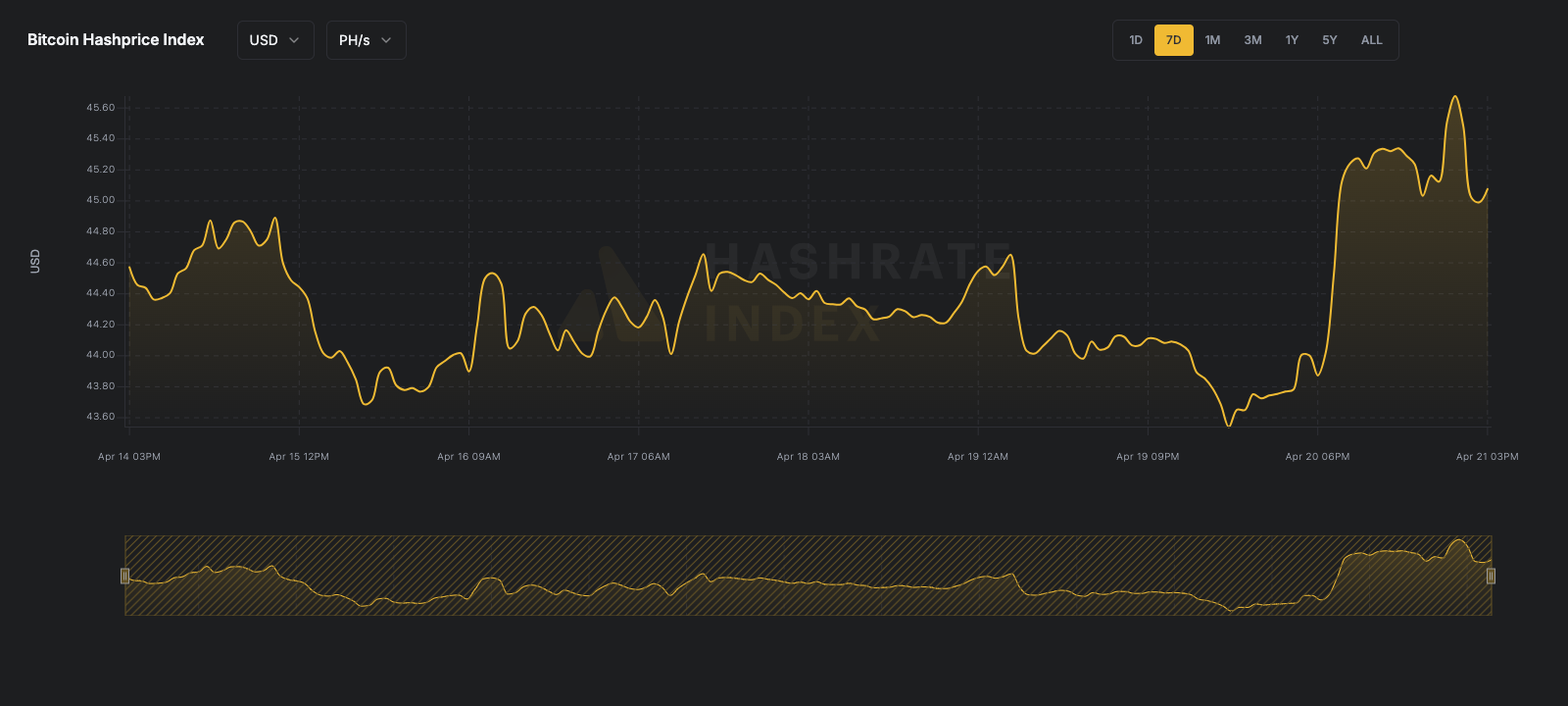 USD hashprice increased by 1.14% from $44.57 per PH/s/Day to a current $45.08 per PH/s/Day.