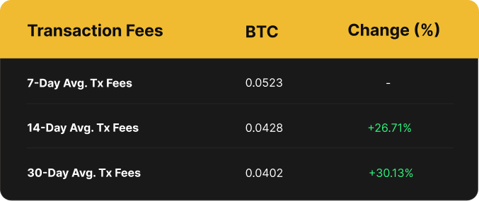 Over the past week, miners collected an average of 0.0523 BTC (per block, per day) in transaction fees compared to the prior week's 0.0428 BTC, a 22% increase.