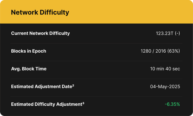 The latest difficulty adjustment took place on April 19, increasing network difficulty by 1.42% to a new all-time high of 123.23T.