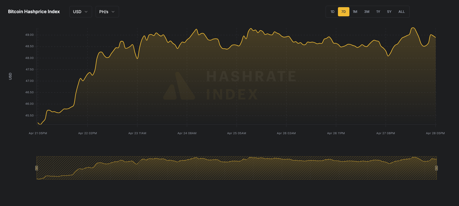 USD hashprice increased by 8.21% from $45.19 per PH/s/Day to a current $48.90 per PH/s/Day.