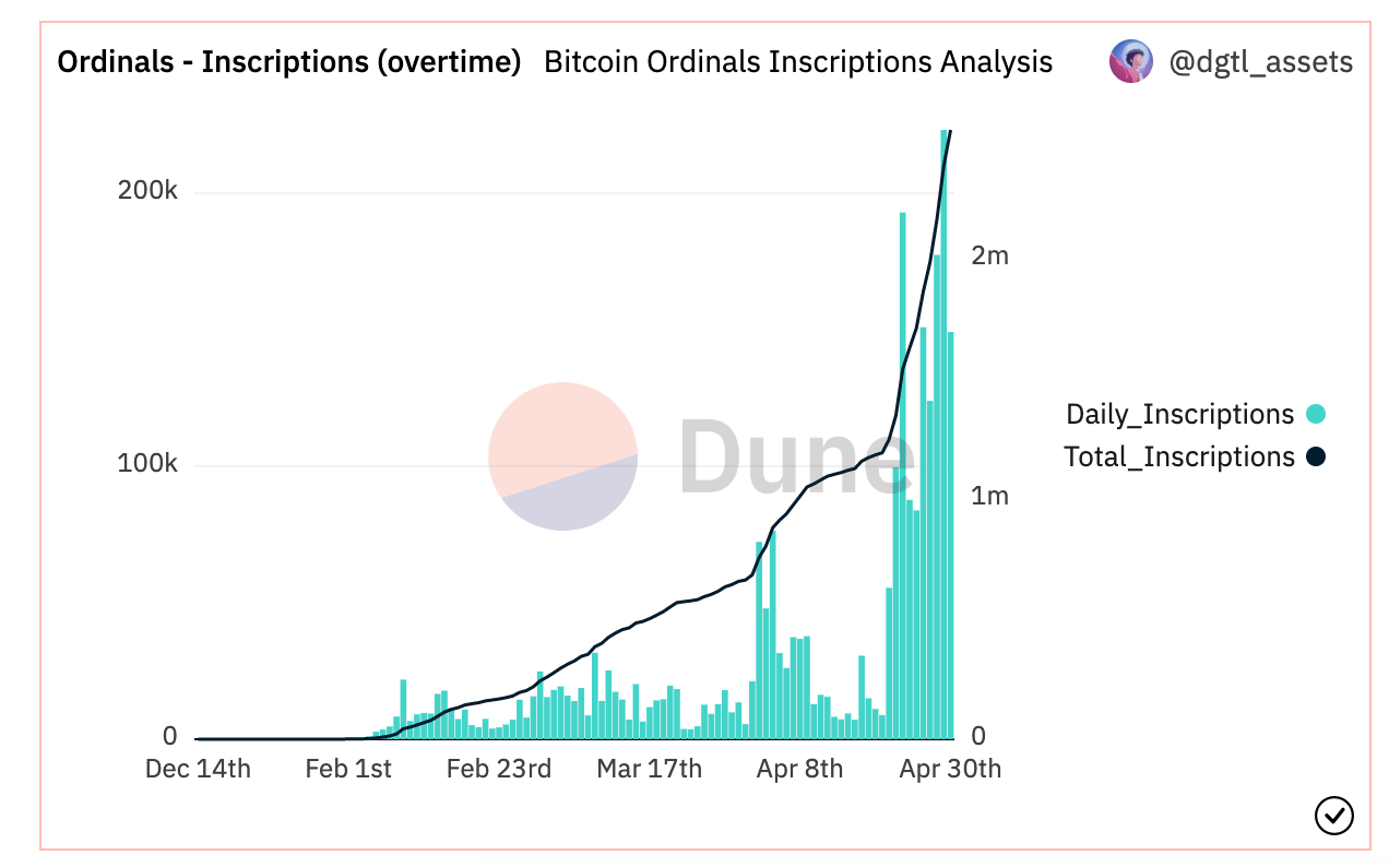 Slower block times means fewer average transactions per hour, so this week's sluggish block times meant a fatter pay day for miners in terms of transaction fees (fees made up 3.78% rewards last week). As block times slowed, Bitcoin users had to bid up fees for priority inclusion in the next block, and these ordinary transactions were also competing with A LOT of inscriptions transactions last week (April 29, for e.g., was an all-time high day for inscription transaction volume, and the third largest daily volume to-date occurred on April 28).