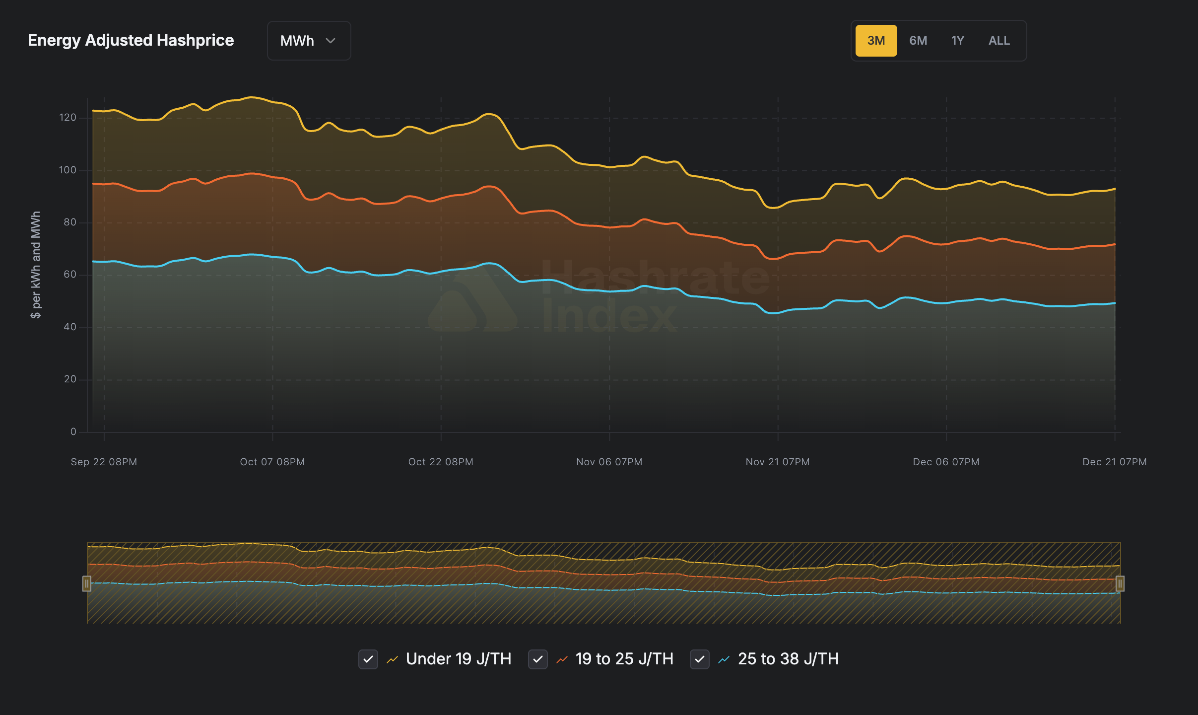 Based on fleet efficiency, bitcoin mining operations are currently earning the following compute revenues per watt-hour:
