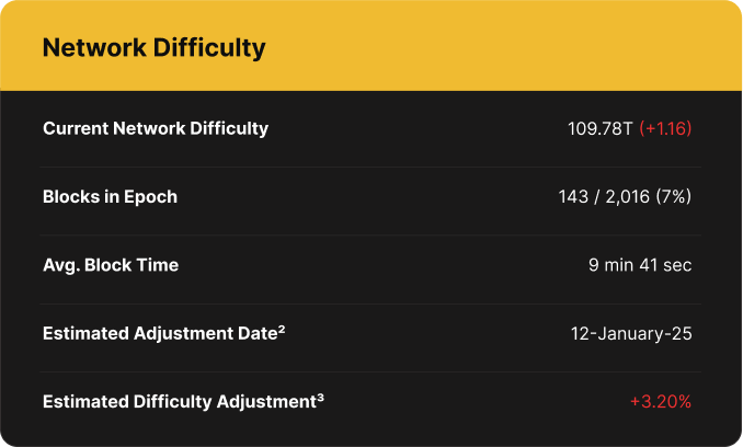 The latest difficulty adjustment took place earlier today, increasing network difficulty by 1.16% to a new all-time high of 109.78T. We estimate an increase of ~3.20% for the upcoming adjustment, expected to occur on January 12th.