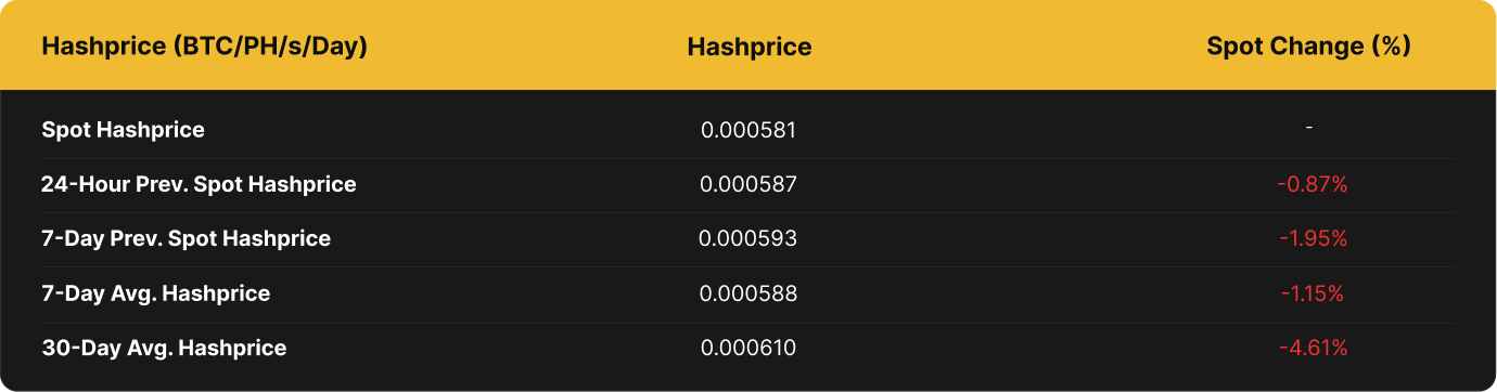 BTC hashprice was relatively more mobile throughout the past week, falling by 1.94% from 0.00059301 BTC per PH/s/Day to a current 0.00058149 per PH/s/Day.