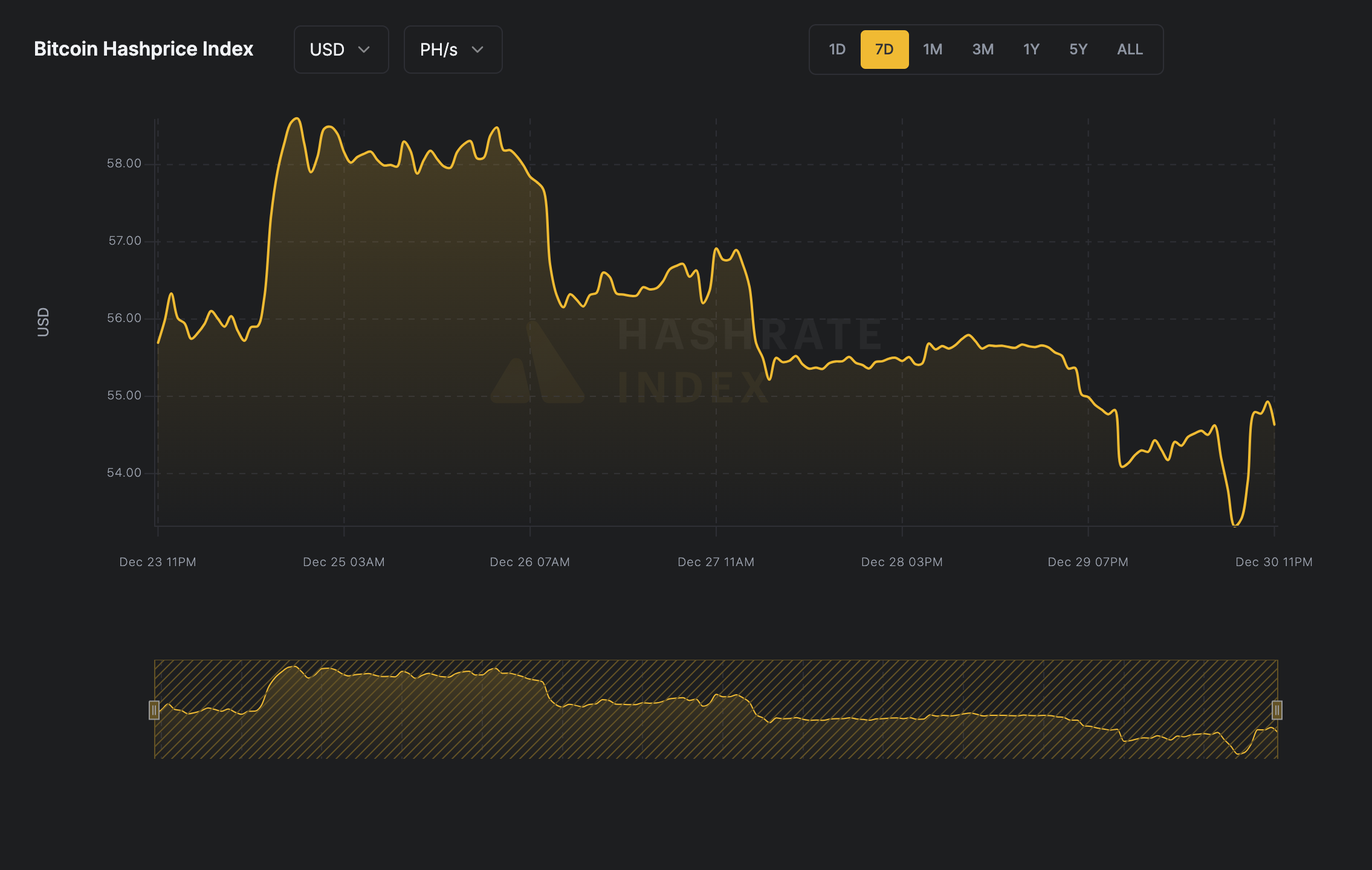 USD hashprice has been on a steady trend, slightly deviating by 0.22% from $55.12 per PH/s/Day to a current $55.00 per PH/s/Day.
