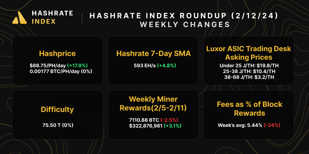 This week's market update is a mix of green, red, and white. Transaction fees fell significantly and posted the lowest weekly average since October 2023. As a result, mining rewards were down in BTC terms, although they are up in USD terms thanks to bitcoin's price action.