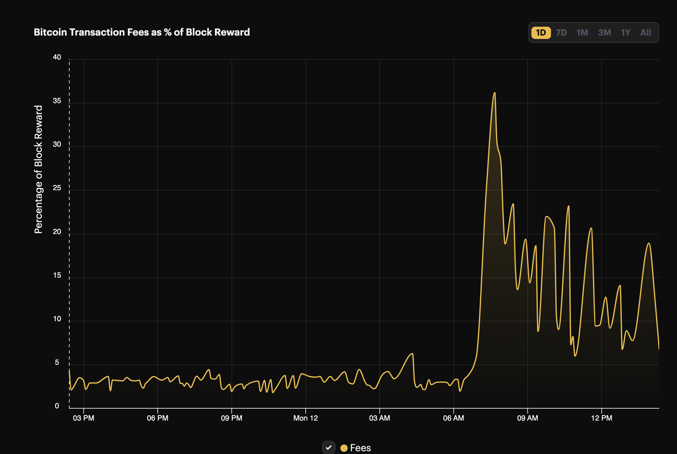 Bitcoin's price is doing most of the heavy lifting here, but a transaction fee spike from inscriptions is giving hashprice a bit of a nudge, as well. This morning, transaction fees rose to as high as 36% of block rewards, and for most of the today, they have stayed above last week's average of 5.44%.