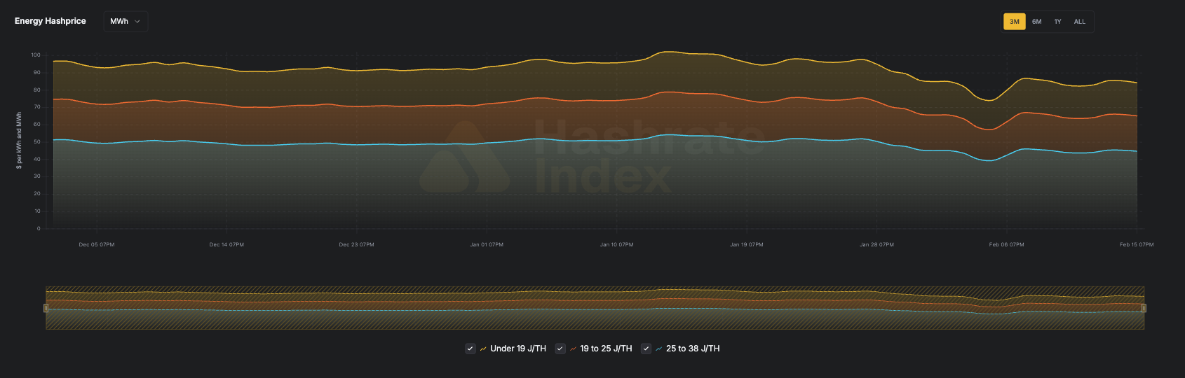 Based on fleetwide efficiency, bitcoin mining operations are currently earning the following SHA-256 compute revenues per watt-hour: