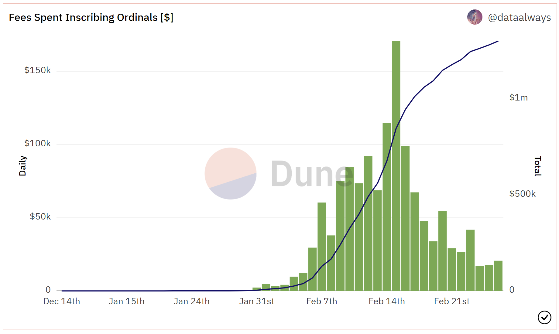 Per analysis from Data Always, the inscription spree is slowing down. Last week, inscriptions only brought in $186,000 in on-chain transaction fee revenue, compared to $568,000 the week prior (this does not include out-of-band payments for inscriptions).