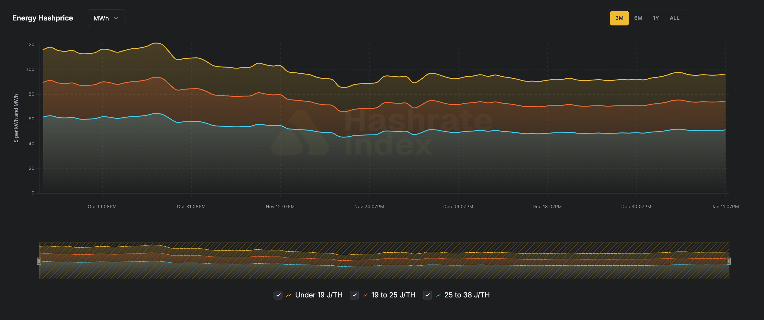 Based on fleetwide efficiency, bitcoin mining operations are currently earning the following SHA-256 compute revenues per watt-hour: