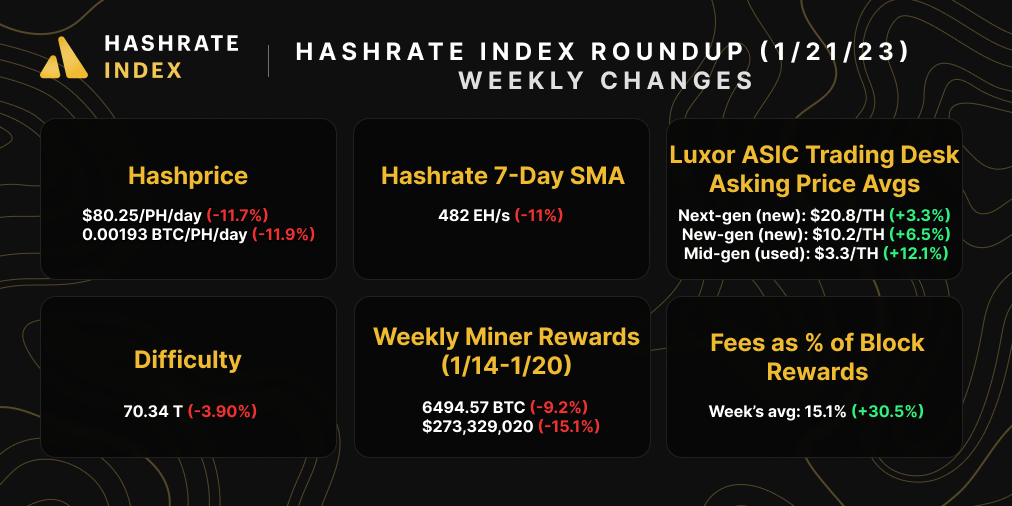 As both Bitcoin's price and transaction fees receded, Hashprice broke below $80/PH/day to a monthly low this past week. But luckily for miners, Bitcoin's difficulty adjusted downward on January 20 by -3.90% – the largest negative adjustment since December 2022.