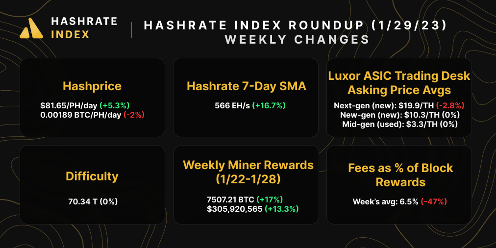 Hashprice hit a multi-month low last week, slumping to $73.96/PH/day on January 23. That was the lowest we had seen hashprice since the first week in November 2023, right before the biggest inscription minting frenzy ever pushed transaction fees – and by proxy, hashprice – on their longest run of the year. (To give an idea of just how lucrative the last two months of 2023 were for miners, Q4 was responsible for 63% ($501.8 million) of 2023’s total transaction fee rewards).