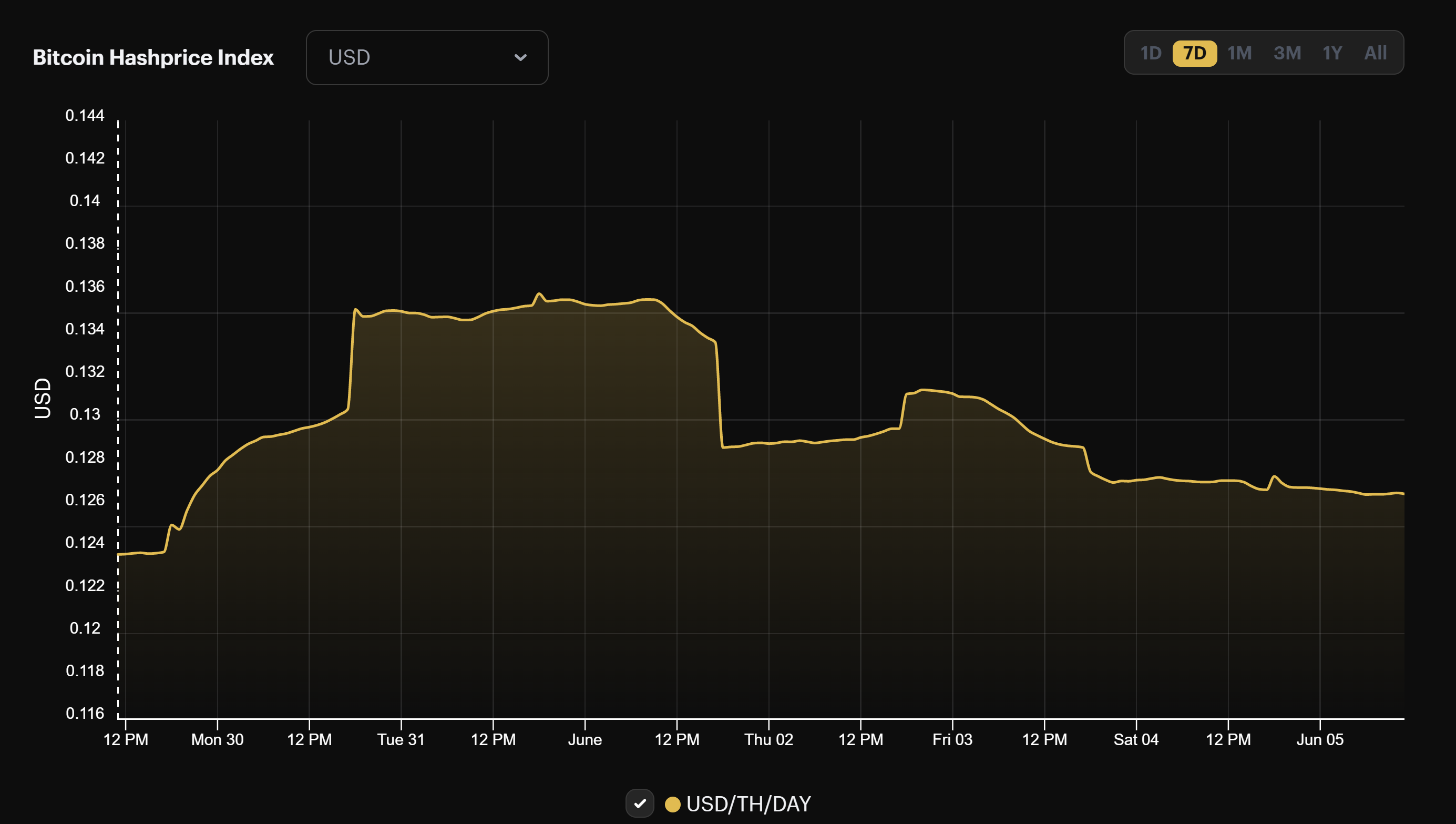 Bitcoin's USD hashprice is floating below $0.13/TH/day and BTC hashprice is staying steady at 425 sats/TH/day. So long as Bitcoin's price remains stable, it's likely that hashprice will increase next week if difficulty drops next week (as we except it to).