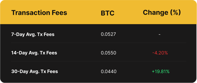 Over the past week, Bitcoin miners collected an average of 0.0527 BTC (per block, per day) in transaction fees compared to the prior week's 0.0573 BTC, a 8% decrease.
