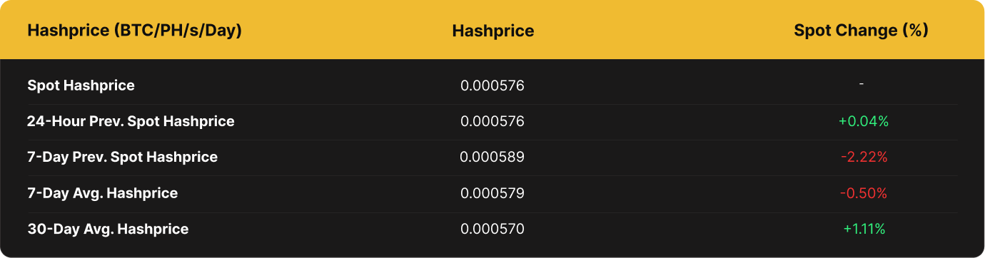 BTC hashprice was down throughout the past week, decreasing by 2.22% from 0.00058921 BTC per PH/s/Day to a current 0.00057612 per PH/s/Day.