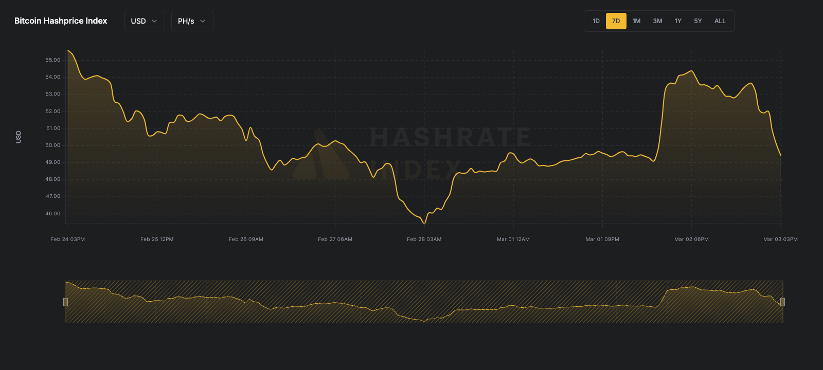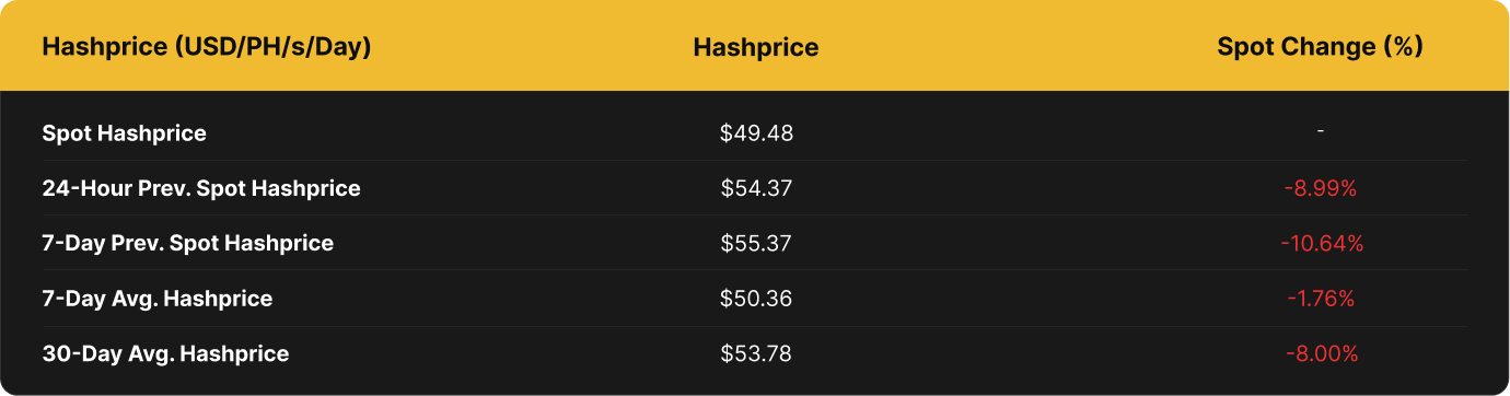 USD hashprice trended down, decreasing by 11.14% from $55.59 per PH/s/Day to a current $49.40 per PH/s/Day.