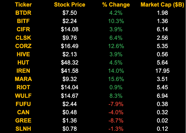 5-day changes to Bitcoin mining stocks as of last week's market close:
