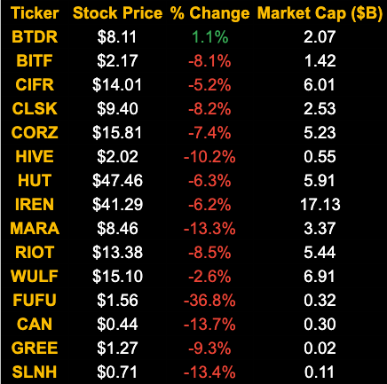 5-day changes to Bitcoin mining stocks as of last week's market close: