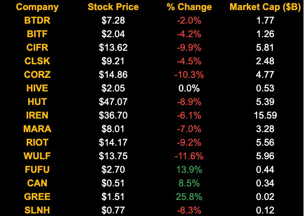 5-day changes to Bitcoin mining stocks as of last week's market close: