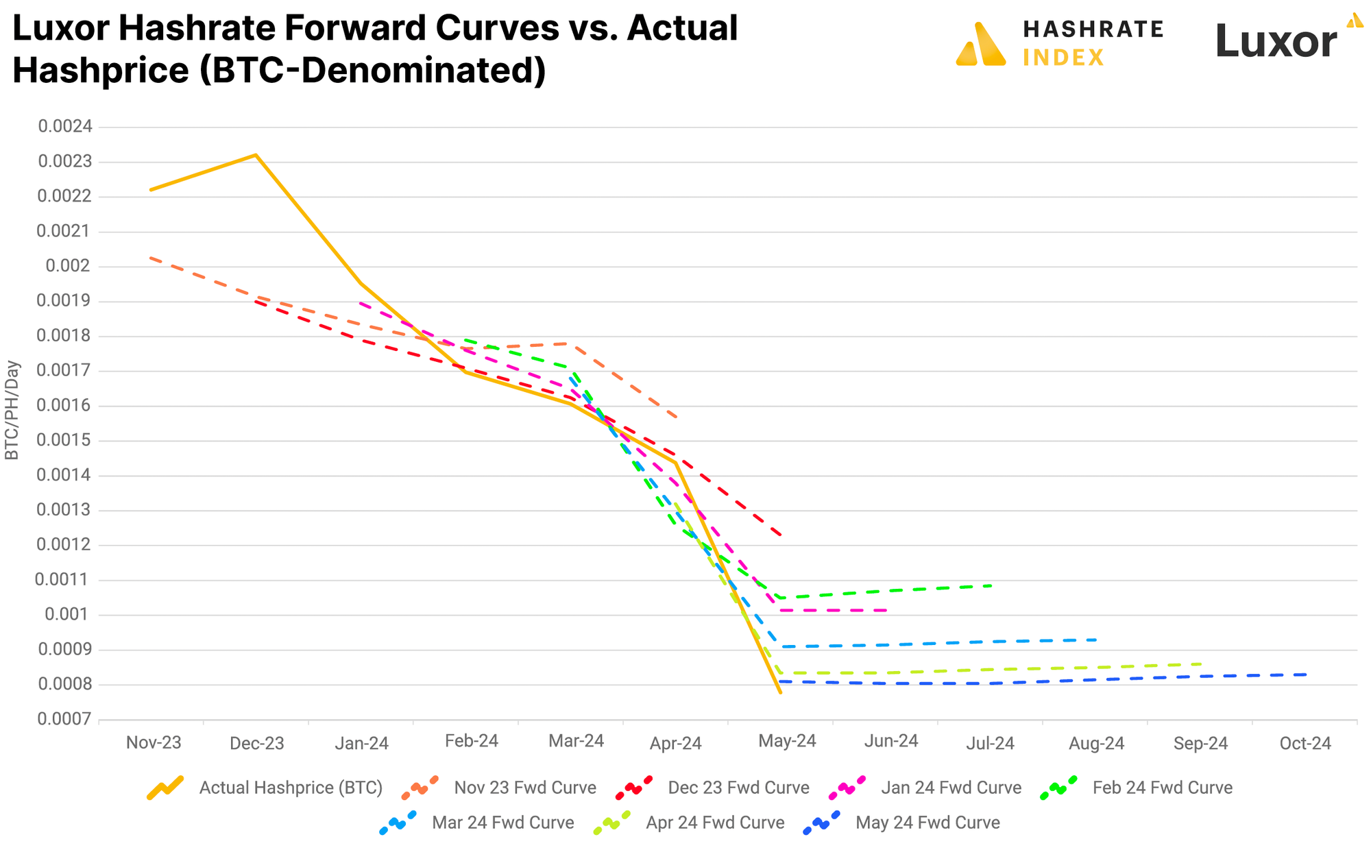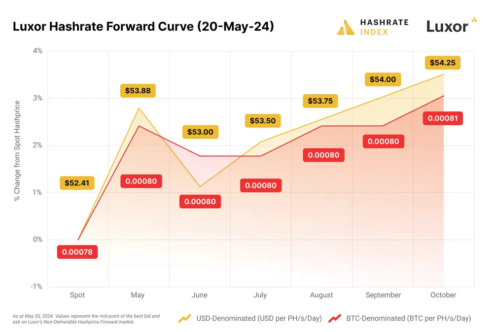 As we noted in last week's update, Luxor's Hashrate Forwards markets have been trading in contango since the Halving, which means that the future quotes for hashprice are trading above spot price.