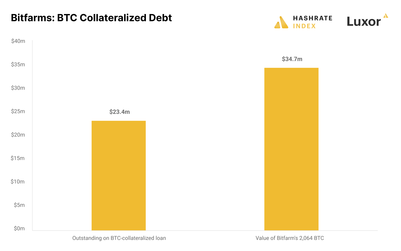 Bitfarms has $55 million outstanding in machine-collateralized loans, of which it owes $31.3 million to NYDIG, $22.2 million to BlockFi, and $1.7 million to Foundry. It also has a bitcoin-collateralized loan of $23 million with Galaxy Digital. As I will soon explain, the company’s bitcoin-collateralized loan is at this depressed bitcoin price dangerously close to liquidation. Further, 1,724 BTC out of its total treasury of 2,064 BTC is collateralized in a loan from Galaxy Digital.