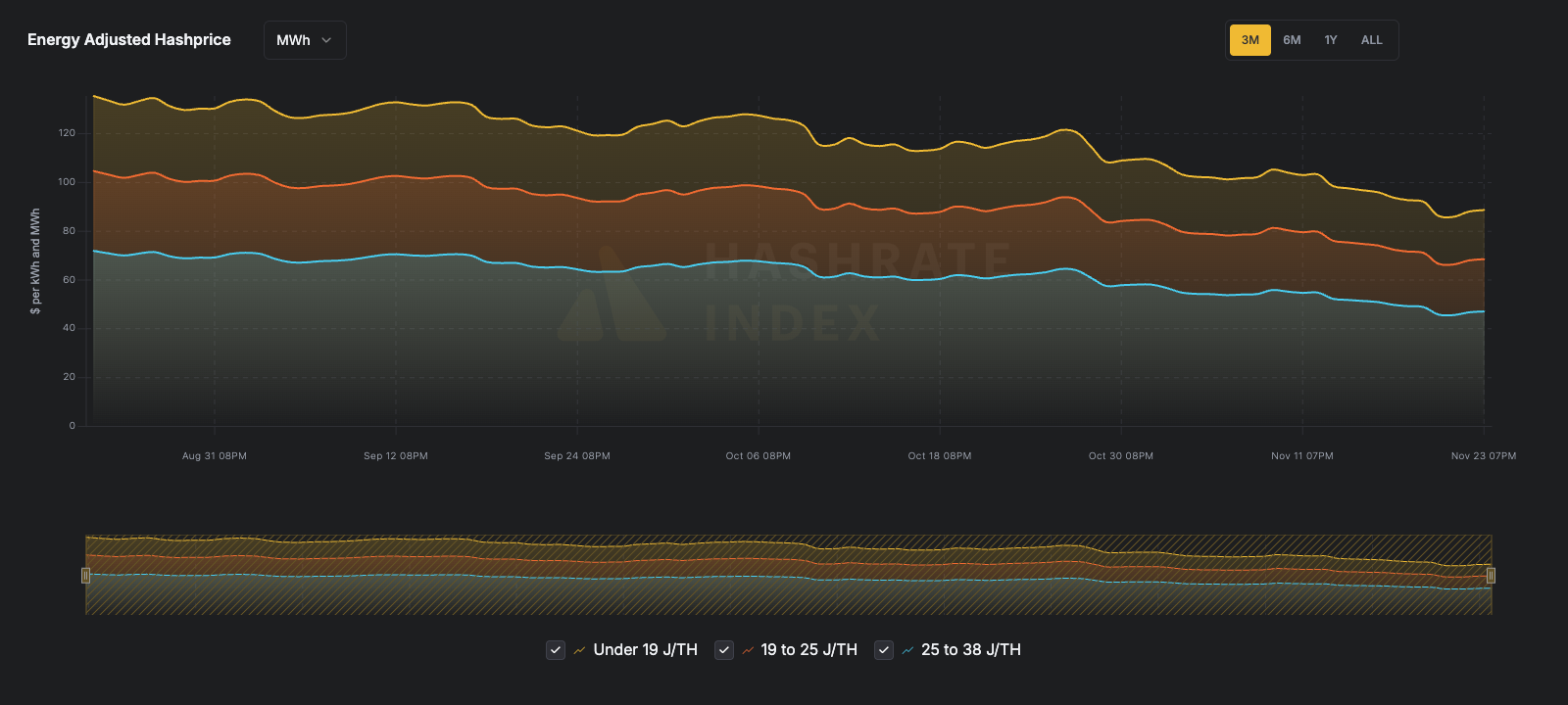 Bitcoin mining operations are currently earning the following compute revenues-per-watt: