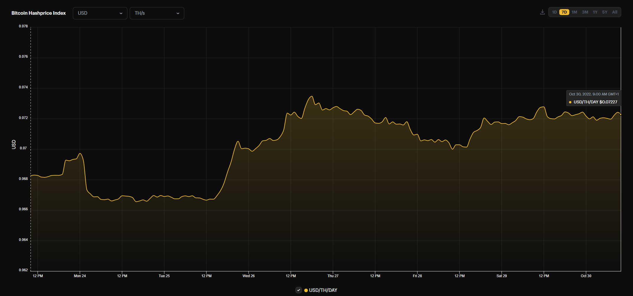 Then, suddenly the bitcoin price awoke from its $19k slumber and has since stabilized at around $20.5k. This 8% bitcoin price increase naturally led the USD hashprice to grow, and it's now sitting at $0.072 per TH/day, 7.5% above its recent all-time low of $0.067.
