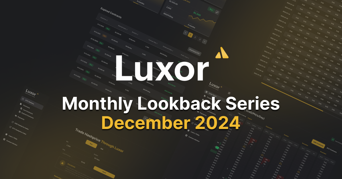 Luxor’s Monthly Lookback Series is a deep dive into Bitcoin hashrate market activity. In this post, we cover December 2024’s hashrate and hashprice trends, forward market participation, trading activity and contract performance.