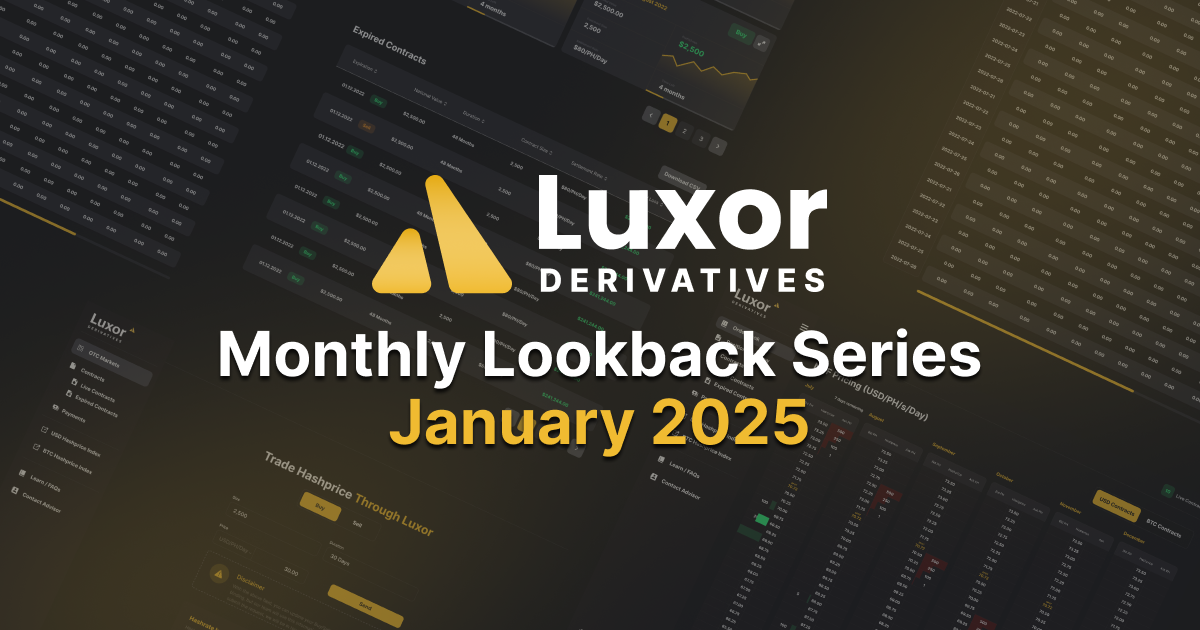 Luxor’s Monthly Lookback Series is a deep dive into Bitcoin hashrate market activity. In this post, we cover January 2025’s hashrate and hashprice trends, forward market participation, trading activity and contract performance.