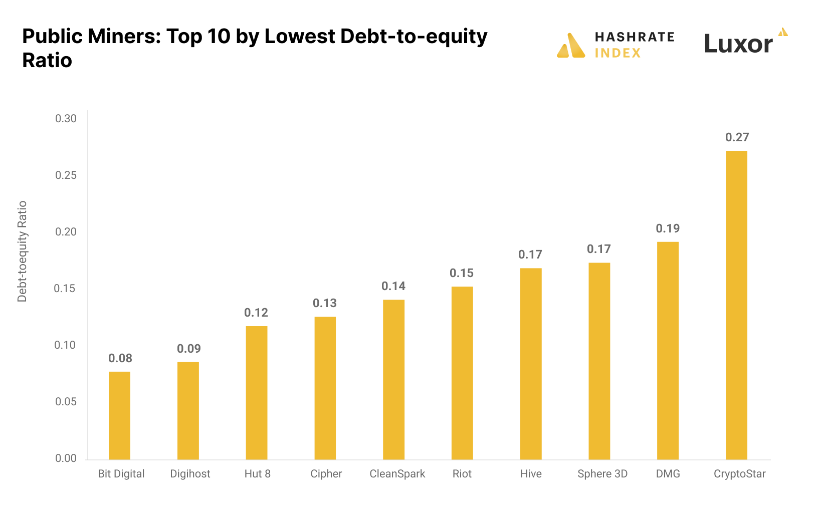 Nothing is more important in a bear market than having a healthy balance sheet. Riot has historically favored equity over debt when financing its operations. This financing strategy has resulted in the Texas-based miner having among the lowest debt-to-equity ratio of the public bitcoin mining firms.