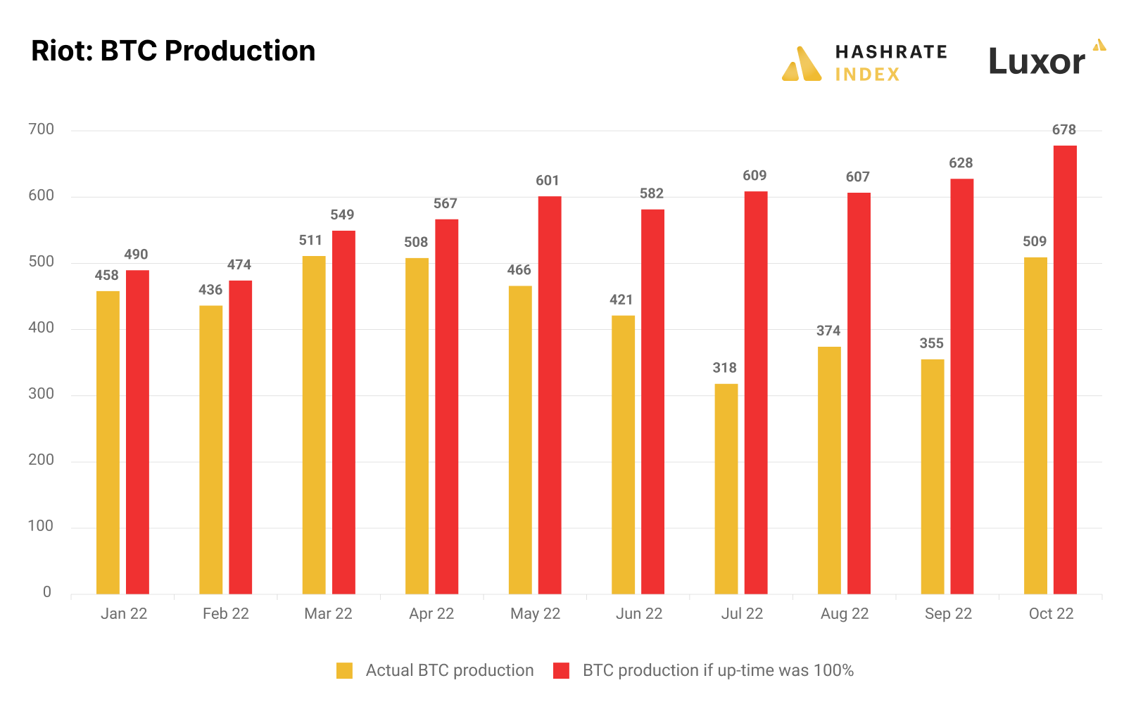 Reduced up-time means less bitcoin produced. The chart below compares Riot's actual bitcoin production with how much it would have generated if its machines were running 100% of the time.