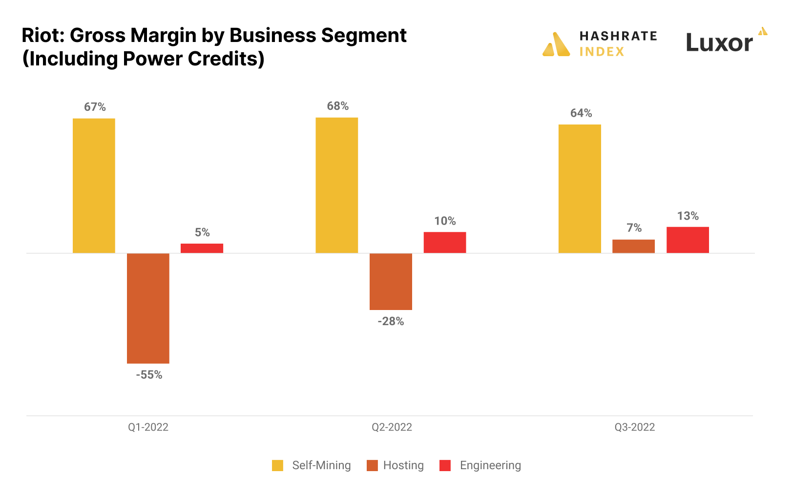 Riot also hosts machines for other bitcoin mining companies. The company's hosting segment generated $8 million in revenues in Q3. This segment has historically struggled with negative margins, but we see a consistent improvement this year from -55% in Q1 to 7% in Q3. An important caveat is that this gross margin also depends on the reduced power costs, which are a function of Riot's participation in demand response programs.