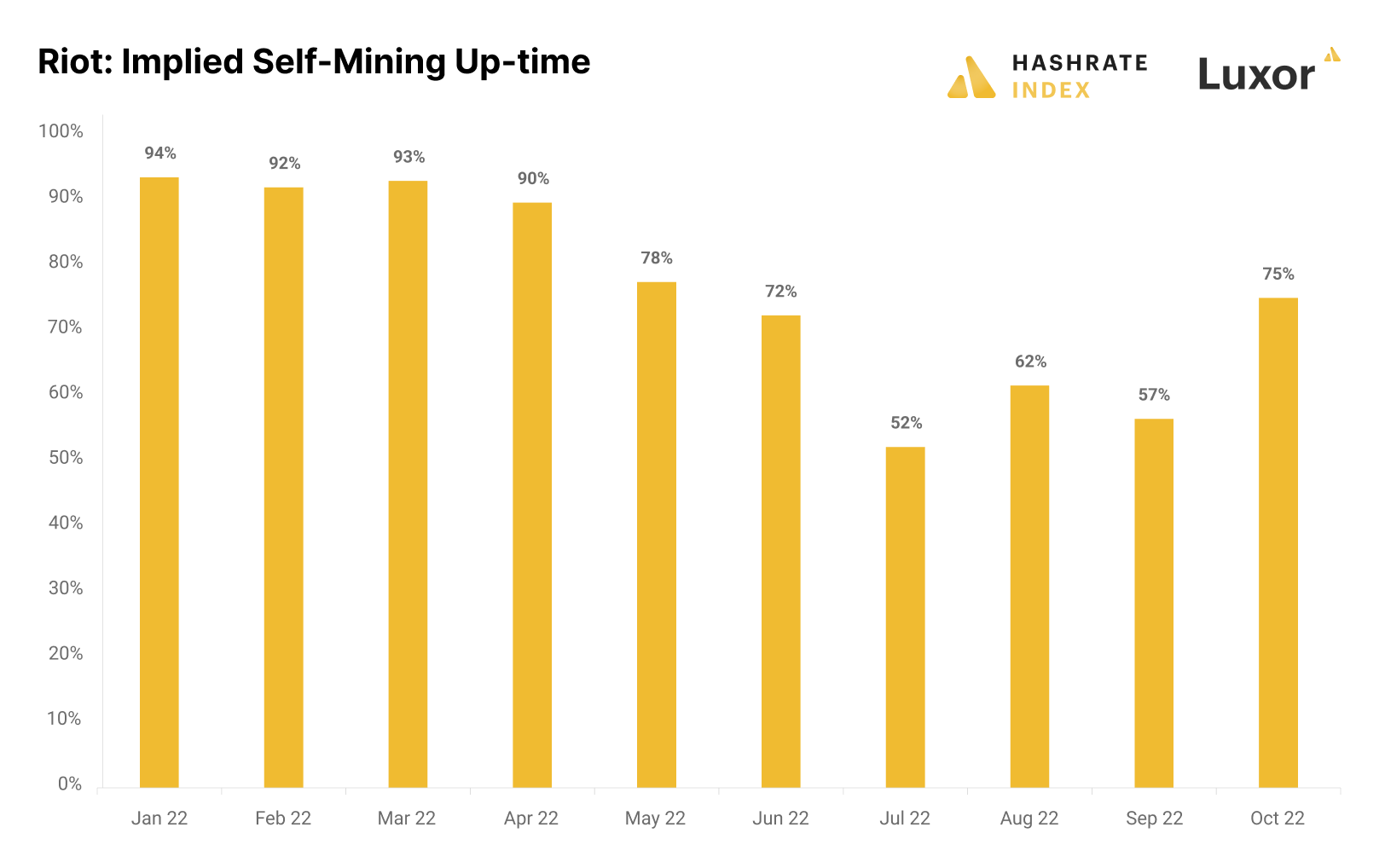 We see that Riot's up-time was consistently above 90% in the first four months of the year before dropping to 78% in May and reaching a low of 52% in July. The up-time stayed very low throughout the summer as Riot participated in demand response programs that helped alleviate pressure on the ERCOT grid as heat waves led to soaring power demand. With the summer heat long gone, Riot's up-time has improved and was 75% in October.
