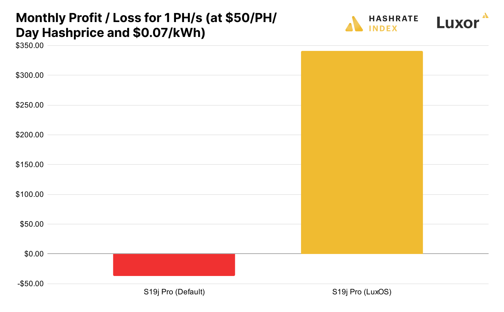 Indeed, when we observe operating margins at current hashprice levels when running an ASIC at default settings versus optimized settings with LuxOS, it becomes clear that miners can improve their operations with after-market firmware. Even next-gen machines like the S21 and S19 XP can earn more when optimized with LuxOS, while older models like the S19 and S19j Pro (which are unprofitable at average power costs with default settings enabled) can turn a profit when underclocked with LuxOS.