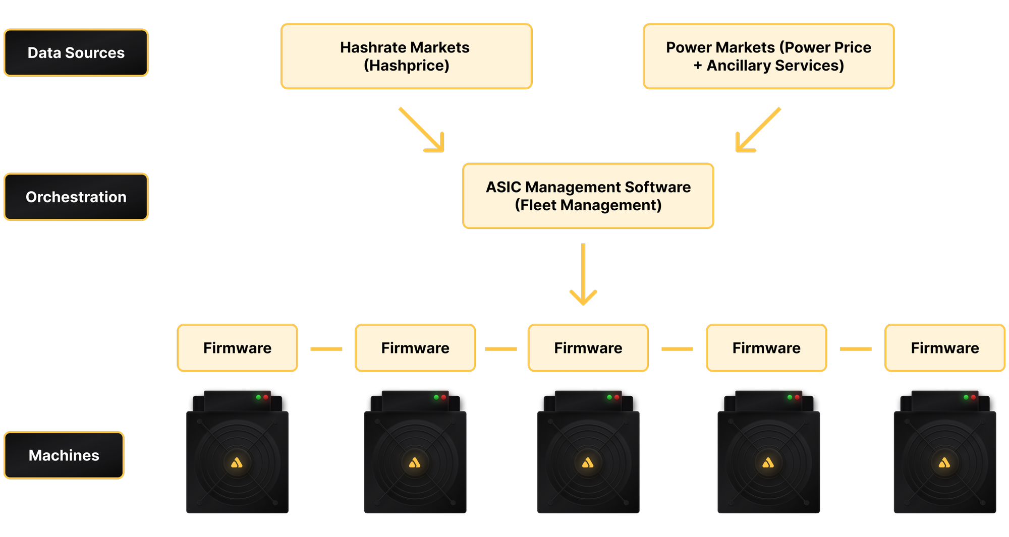 Most miners still rely on manufacturer stock firmware, which was designed for a bygone era of binary mining: machines run at full throttle until power costs force shutdowns. These systems offer no adaptability, no efficiency tuning, and no ability to interact with market signals.