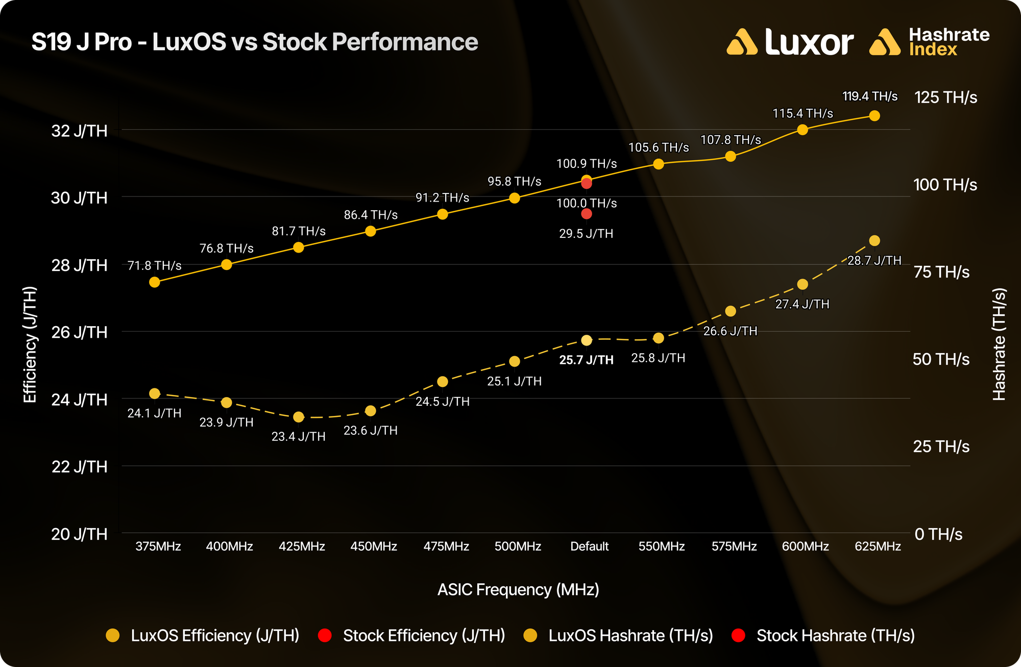 Taking the quintessential mining machine, Bitmain’s Antminer S19j Pro, as an example: running LuxOS unlocks the ability to operate this model in frequency ranges anywhere between 375MHz to 625MHz, producing hashrate outputs ranging from ~70 TH/s to ~120 TH/s, while consuming proportionally varying amounts of power.