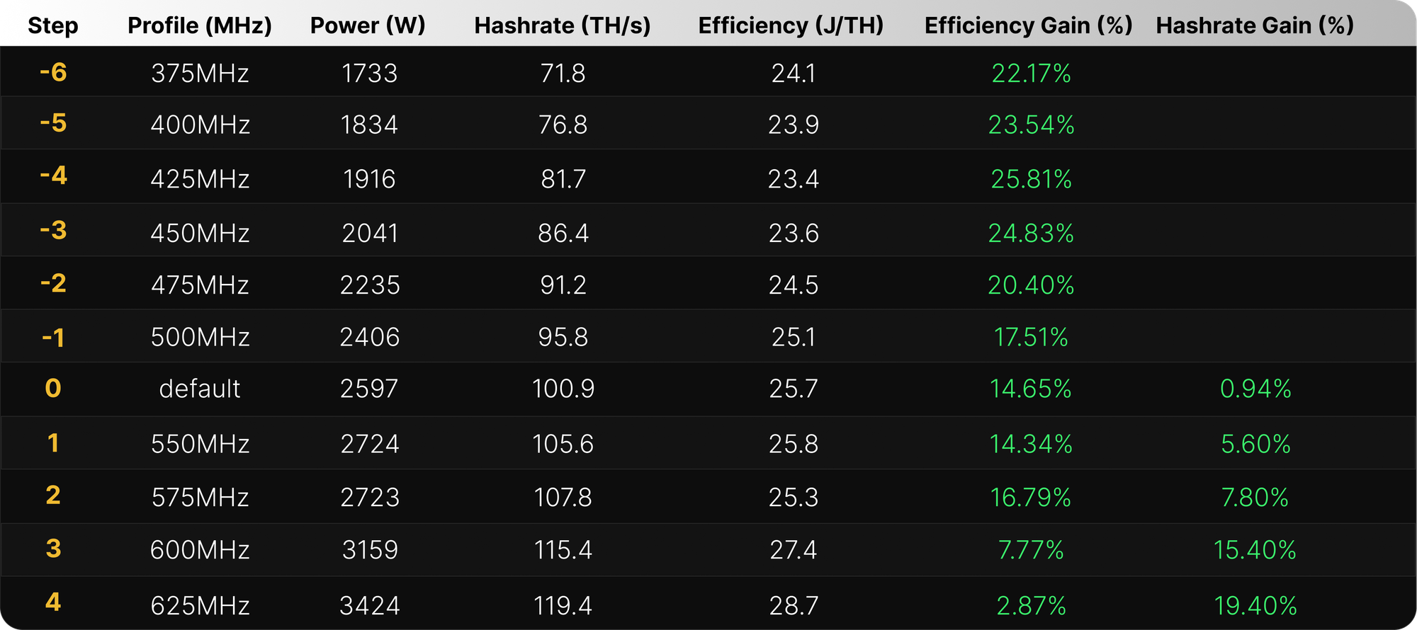 When the machine is in default AutoTune mode (not overclocking or underclocking), a direct increase in efficiency by ~15% is observed. When optimizing for maximum hashrate, moving to a heavy overclock step (+4) will increase hashrate by ~19%. If optimizing for best efficiency instead, moving to a heavy underclock step (–4) will improve efficiency by ~26%.