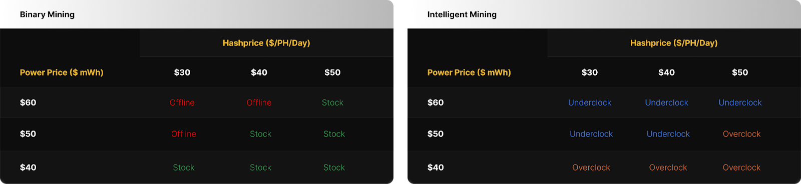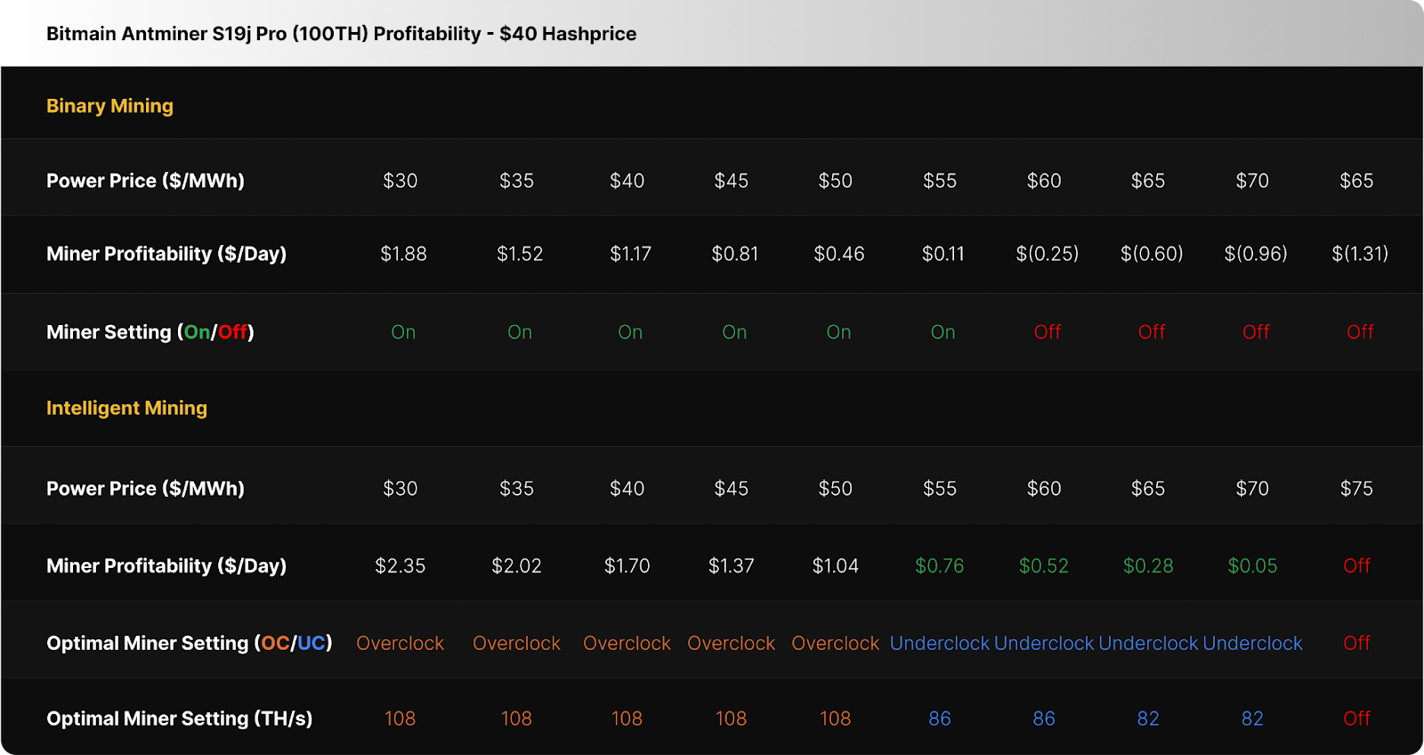 The table below shows how an Intelligent Miner would respond to the same scenario. At a $40 per PH/s/day hashprice, the operation would simply “shift gears into efficiency mode” and continue to run the fleet of S19j Pro’s at power prices above $60 per MWh, until it reaches shutdown at $75 per MWh. In this case, the change in gears is a down-shift, otherwise known as underclocking — the process of running a machine’s individual ASIC chips at a lower frequency and/or voltage versus stock settings. By dialing frequency down, the chips perform fewer hashes per second, reducing total hashrate output (TH/s). However, power draw falls proportionally more than hashrate, which means lower joules per terahash, improving efficiency (J/TH) as a result. This allows the Intelligent Miner to continue hashing and squeeze out additional revenue as it slowly declines to a stop, when necessary. Meanwhile, the binary miner is stuck in a loop between hard stops and restarts, covering less ground.