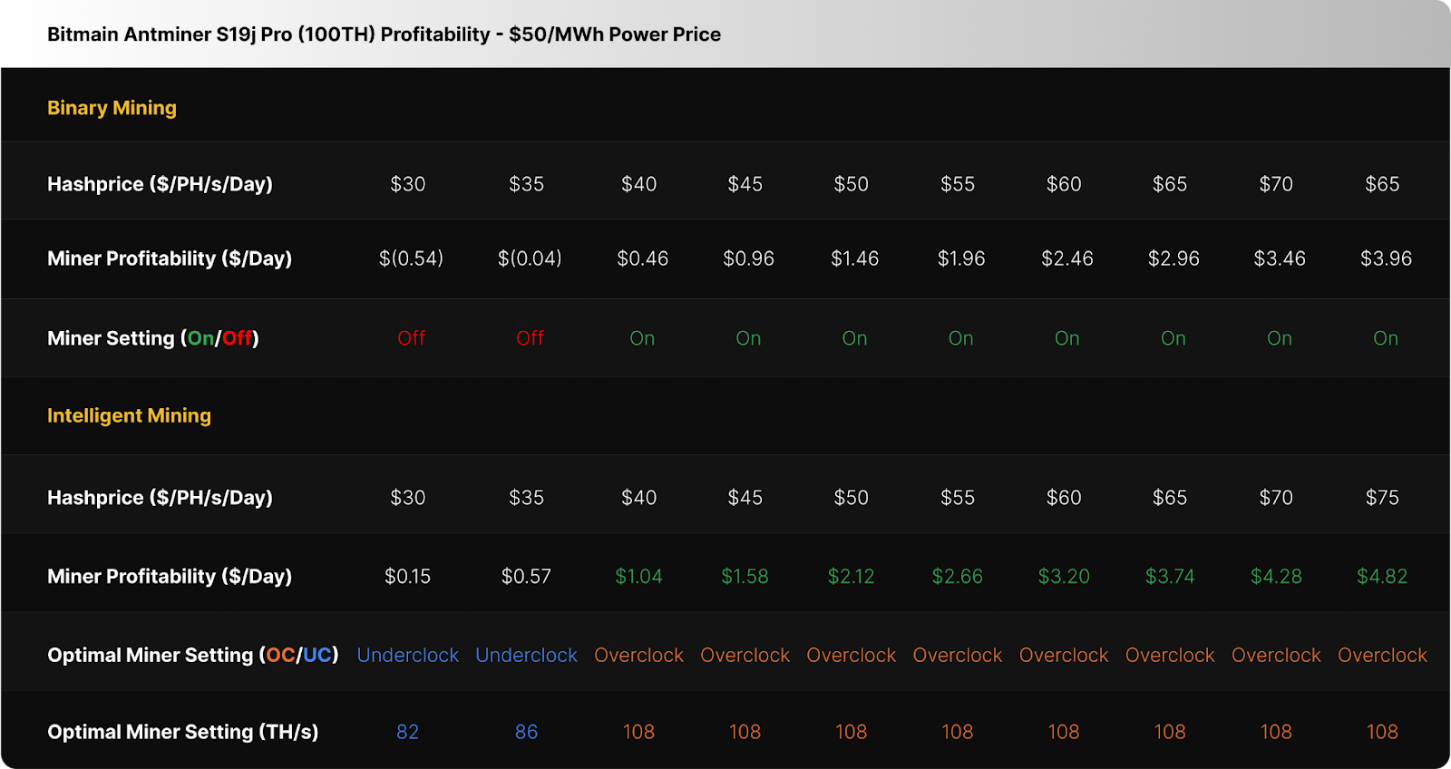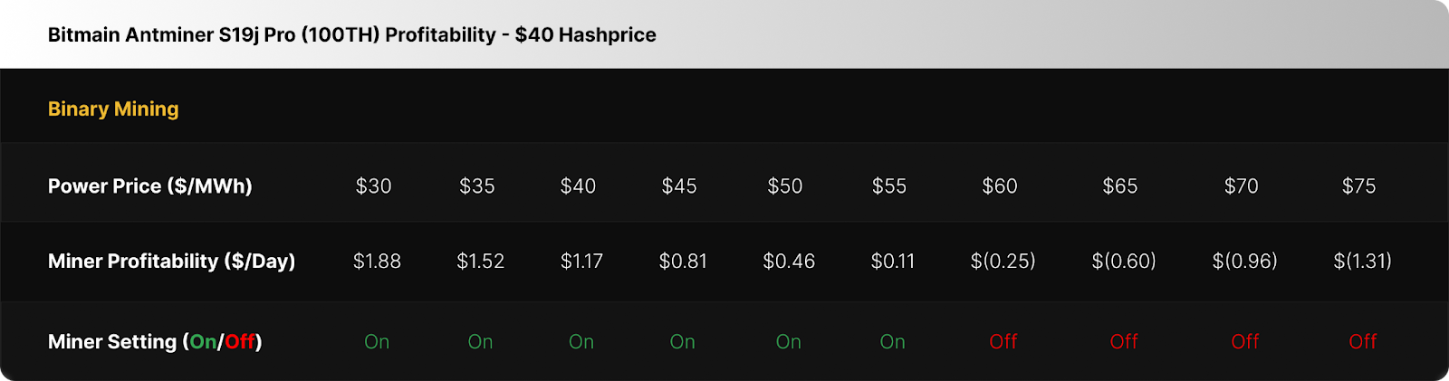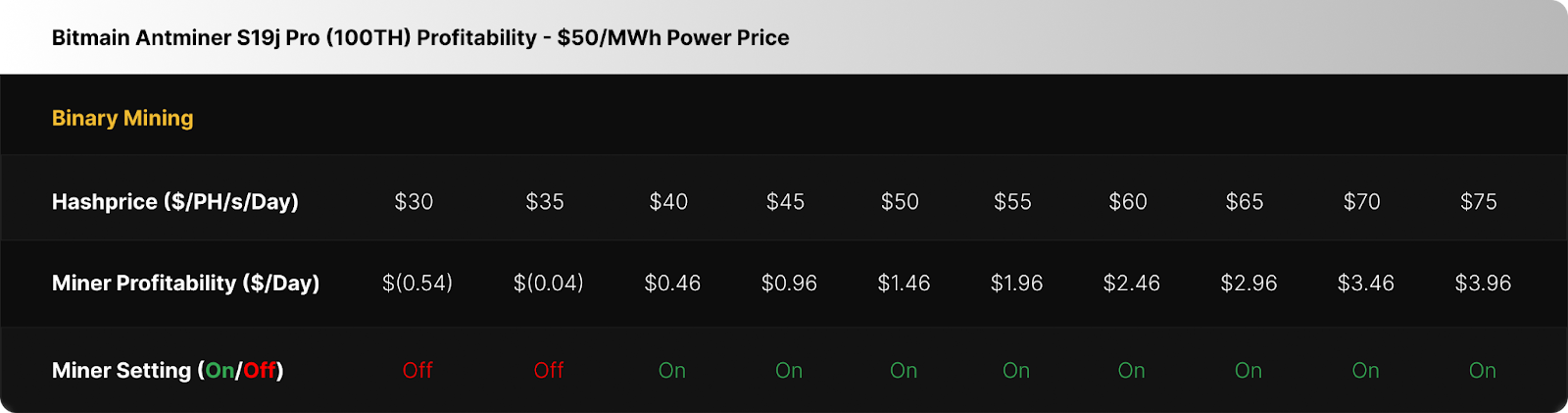 At a $50 per MWh power price, the binary miner running a fleet of S19j Pro’s turns on at hashprices above $35 per PH/s/Day and beyond, in order to operate profitably.