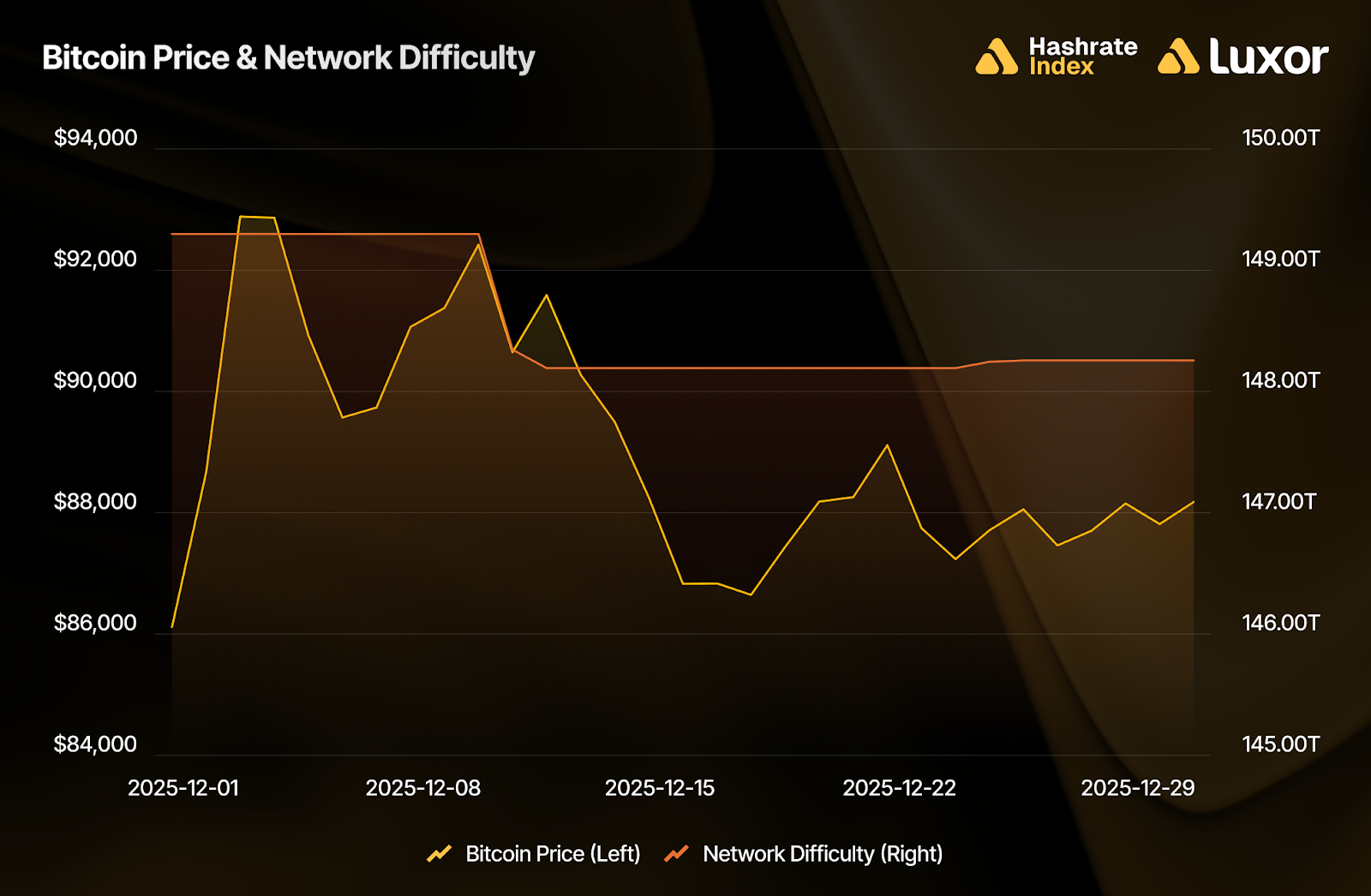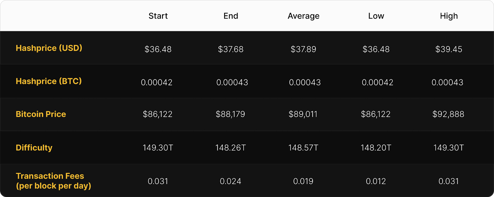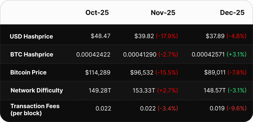 - Hashprice Hit an All-Time Low: BTC price fell 7.8% month-over-month to an average price of $89,011, transaction fees dropped 9.6% to 0.019 BTC per block, and USD hashprice marked an all-time monthly average low of $37.89 per PH/s/day.